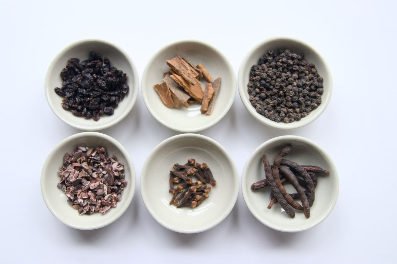 Clockwise: Barberries, Kenyan Cinnamon, Zanzibari Black Pepper, Selim Pepper, Cloves, Cacao Nibs