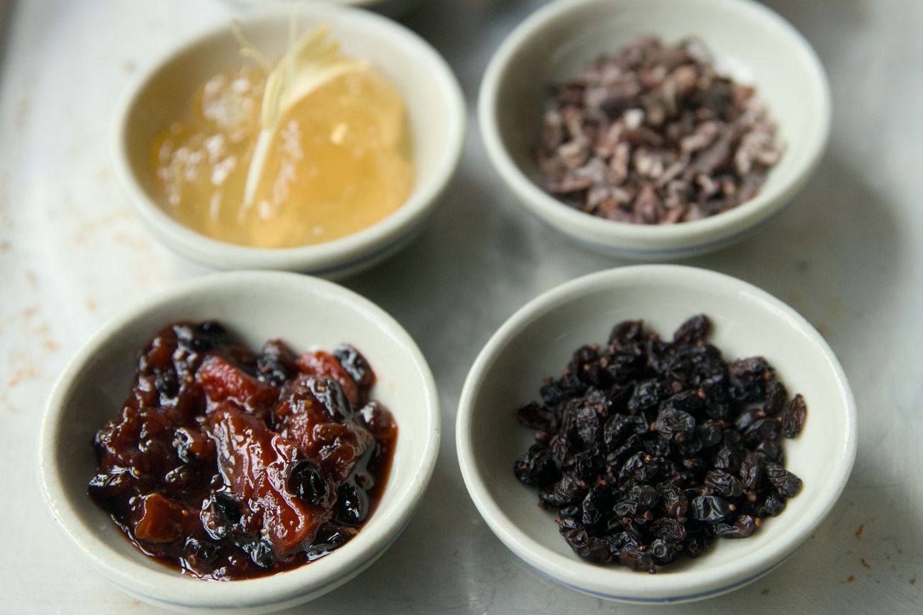 Clockwise: Honeysuckle Jelly, Cacao Nibs, Barberries, Strawberry Barberry Jam