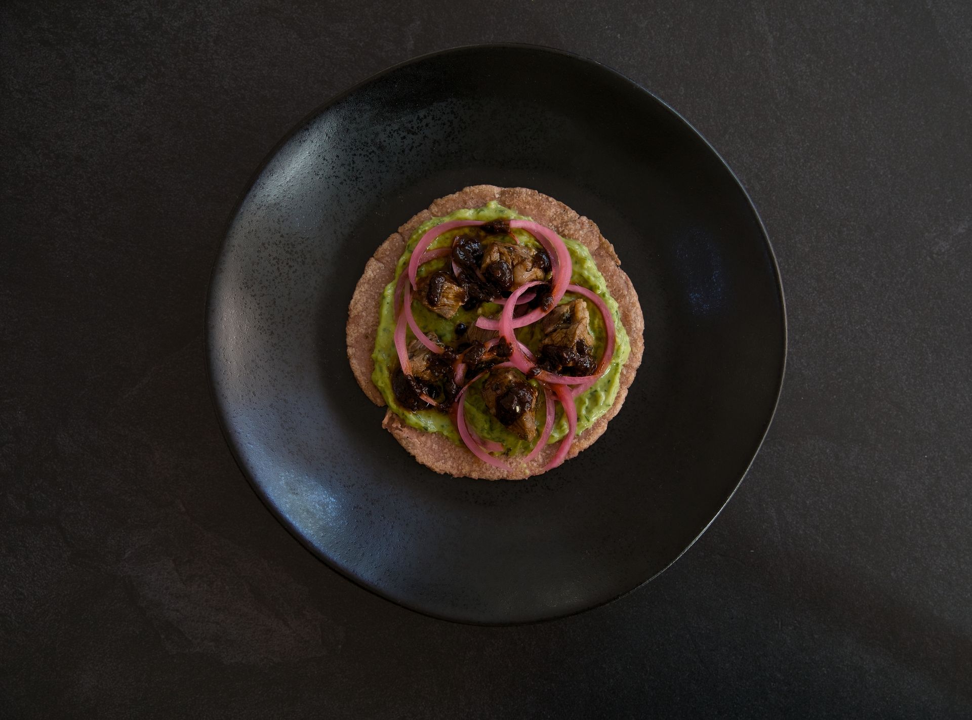 Taco: red corn tortilla, guacamole, steak, pickled red onions and salsa negra