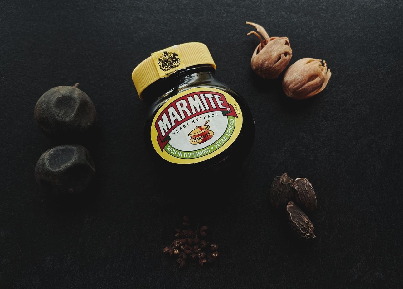 Clockwise: Marmite, Mace, Black Cardamom, Szechuan Red Peppercorns, Omani Black Limes.