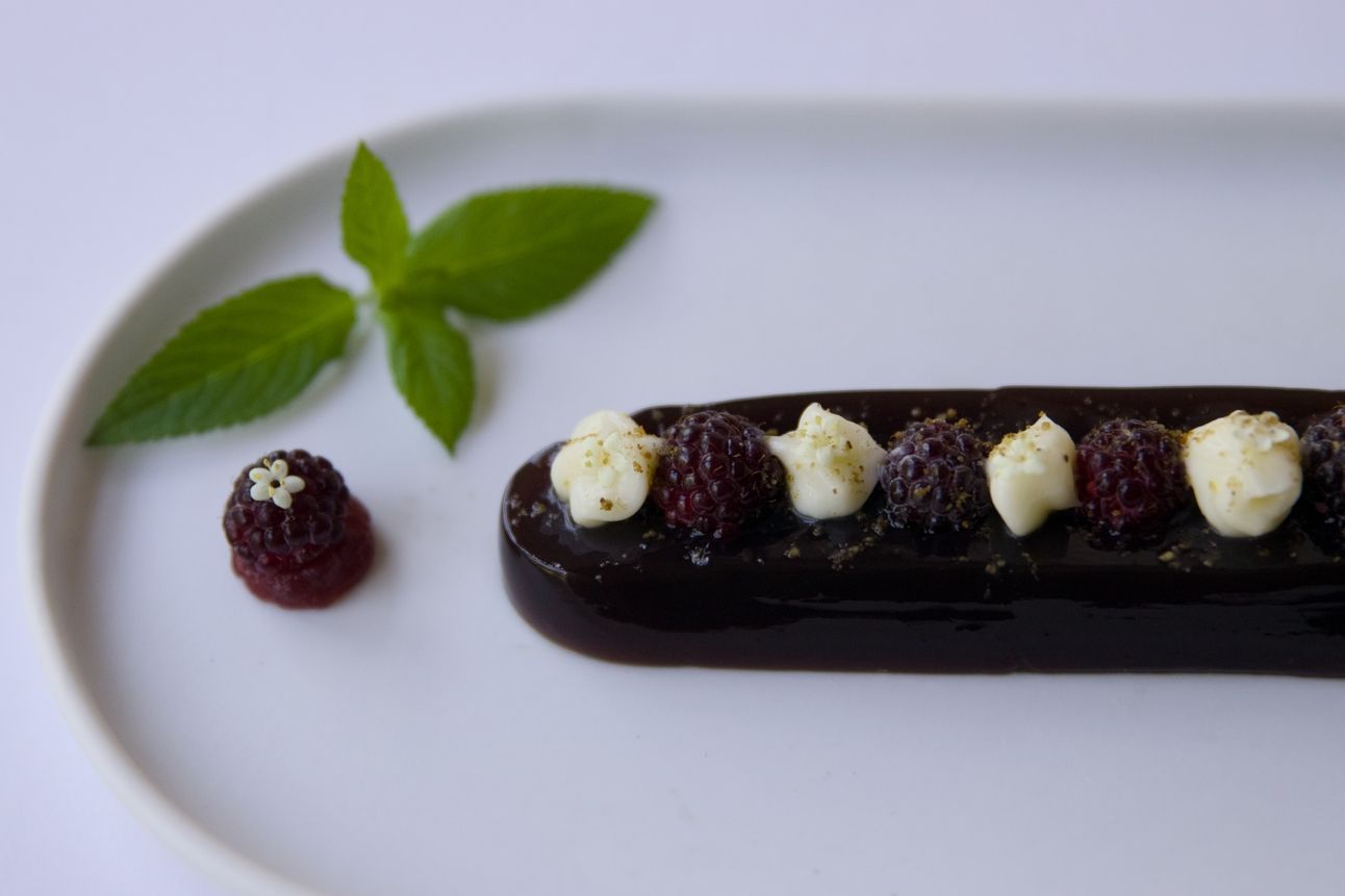 JELLY: This one is composed of mostly wild grapes and elderberry juice, flavored with spicebush (Lindera benzoin). Garnished with black raspberries, mascaporne and Procera botanical salts (similar to sal de gusano/chapulín in its use). And on the side we have elderberry gel with a black raspberry and an elderflower. This was served with a strawberry rum infusion that is not pictured given how shallow the platter is.